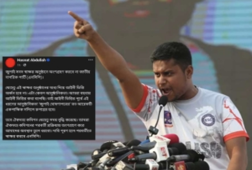জাতীয় নাগরিক পার্টি (এনসিপি) জুলাই সনদ স্বাক্ষর অনুষ্ঠানে অংশগ্রহণ করবে না বলে জানিয়েছেন জাতীয় নাগরিক পার্টির (এনসিপি) দক্ষিণাঞ্চলের মুখ্য সংগঠক হাসনাত আব্দুল্লাহ। শুক্রবার (১৭ অক্টোবর) সকালে নিজের ভেরিফায়েড ফেসবুক অ্যাকাউন্টে এক পোস্টে তিনি এ কথা লিখেছেন।
