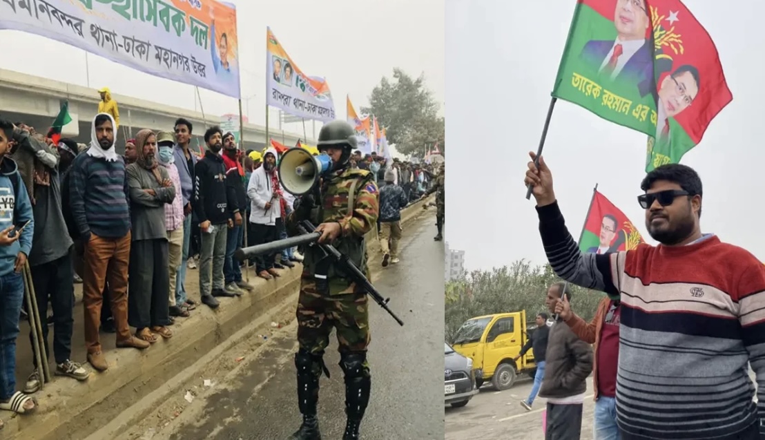 কুড়িল থেকে নেতা-কর্মীরা পায়ে হেটে মূল মঞ্চের দিকে যাচ্ছেন। কুড়িল ফ্লাইওভারে সেনাসদস্যরা অবস্থান নিয়েছেন। নিচে মূল সড়কেও সেনাসদস্যদের দেখা যাচ্ছে।